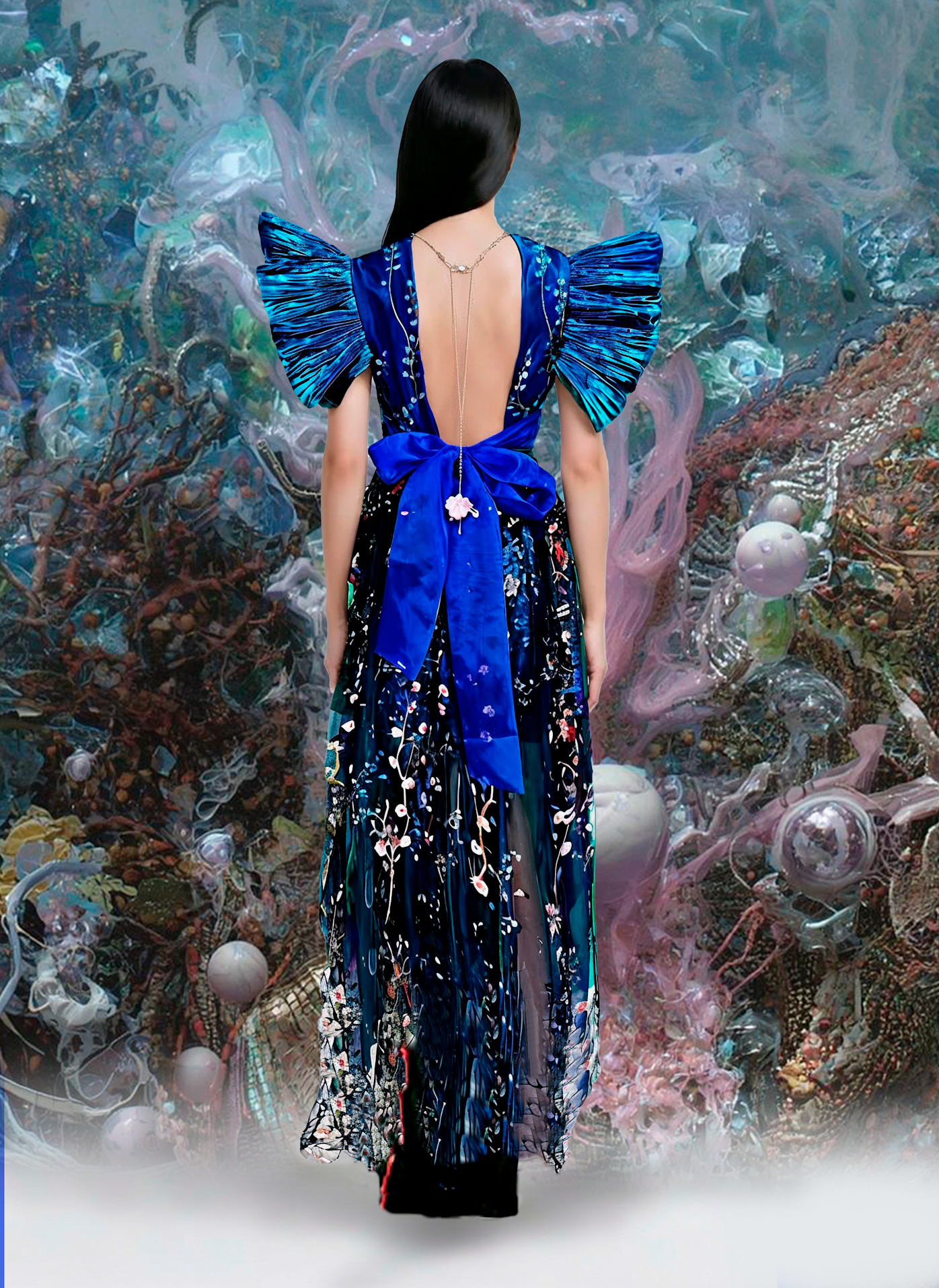 Vestido largo compuesto por capas de tul floreado sobre fondo negro y lentejuelas azules. Exuberantes mangas en azul metalizado. Cuello a la caja y escote profundo semitransparente en organza azul klein. Detalle de lazos en la cintura.