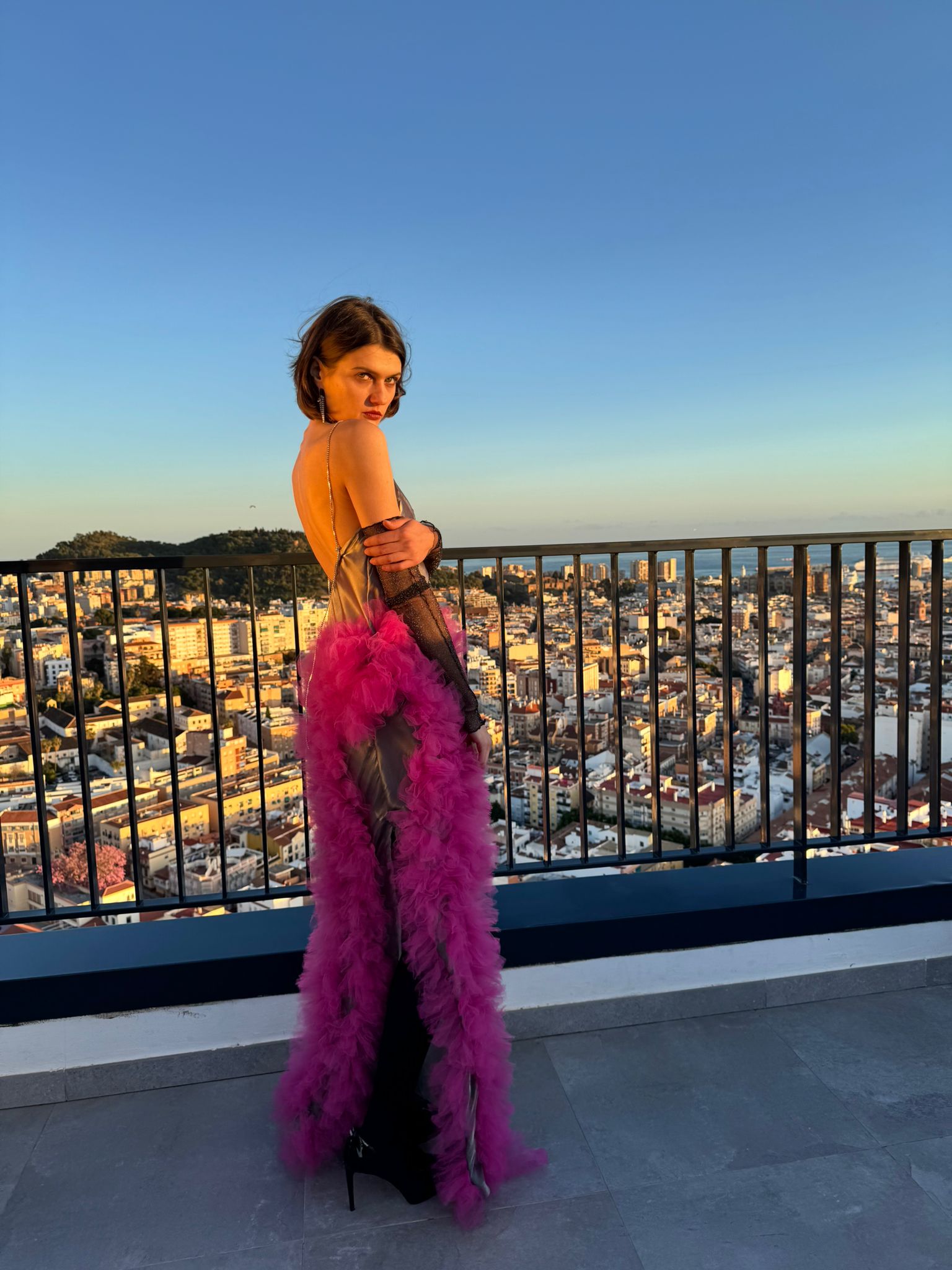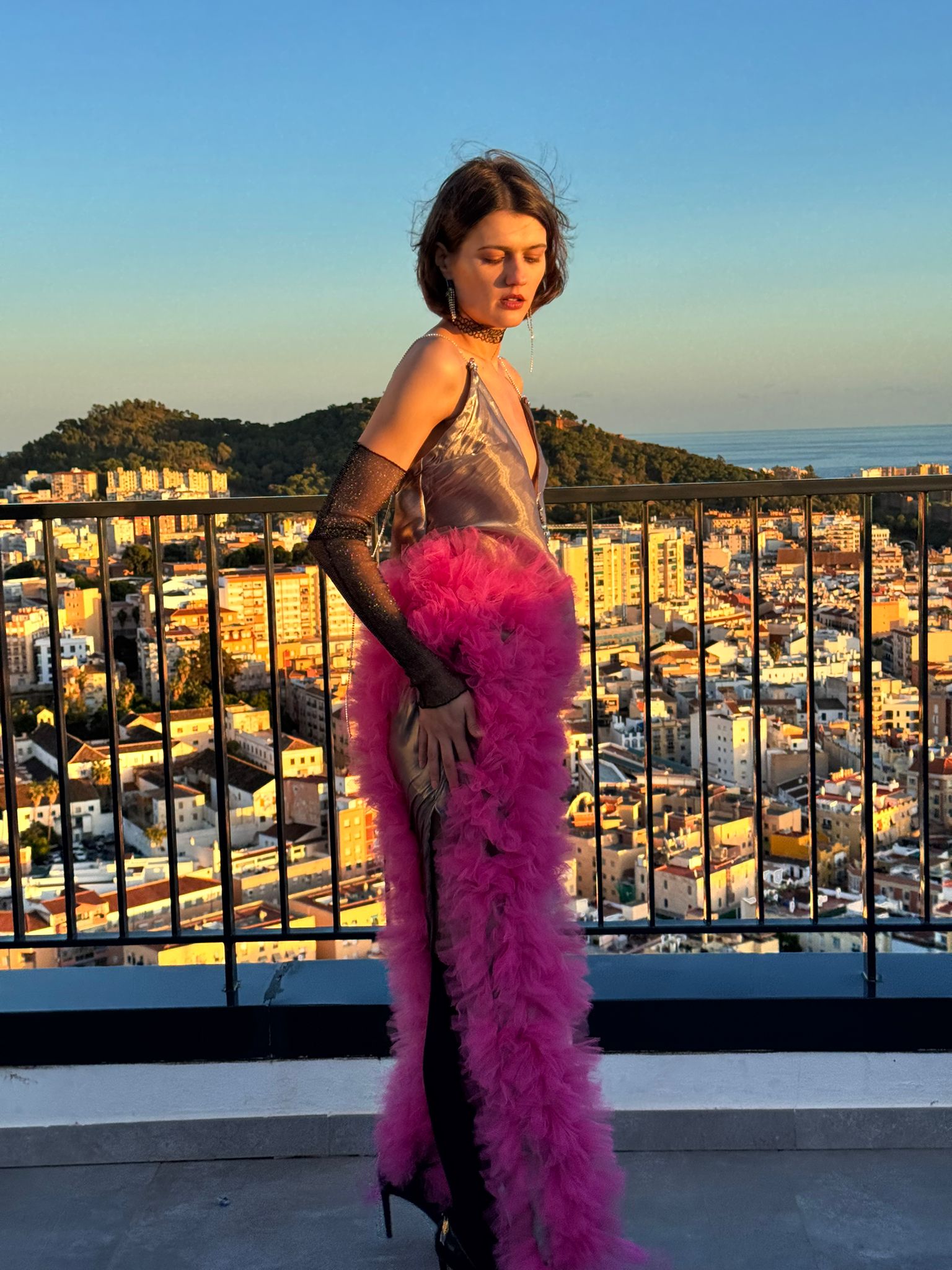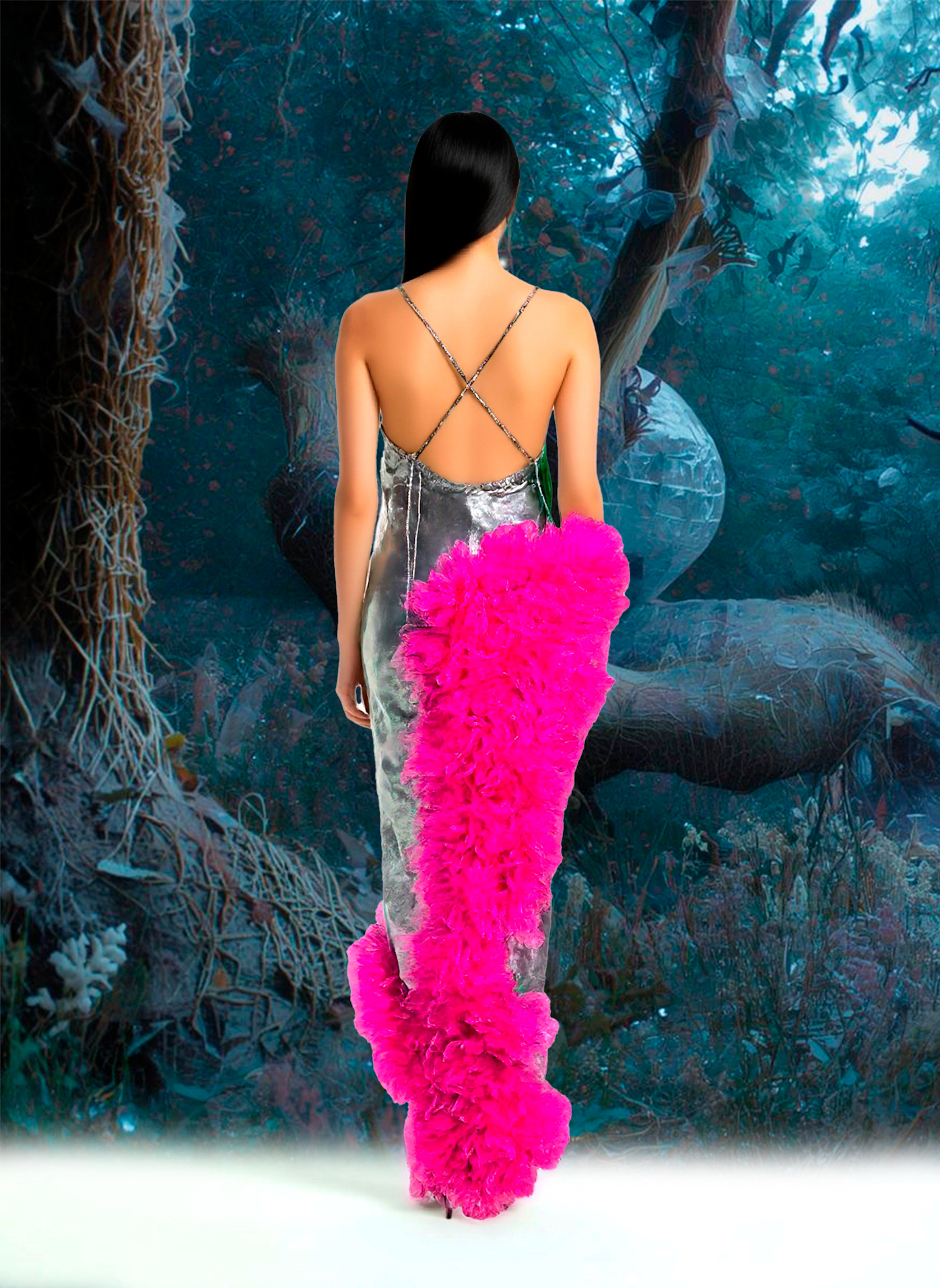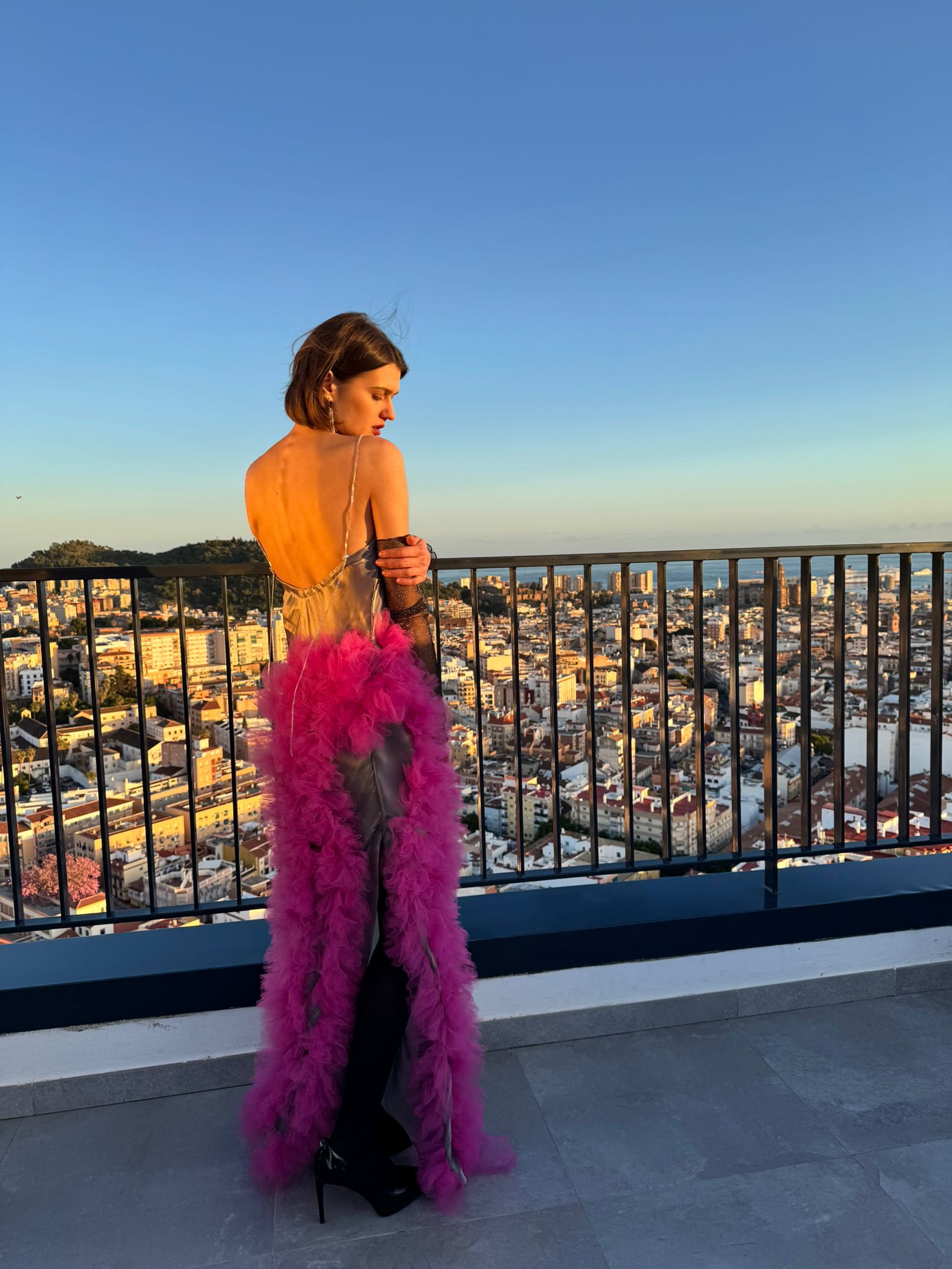Vestido al bies de estilo lencero de raso  en color gris metalizado con gran cascada de tul fuxia en el lateral.