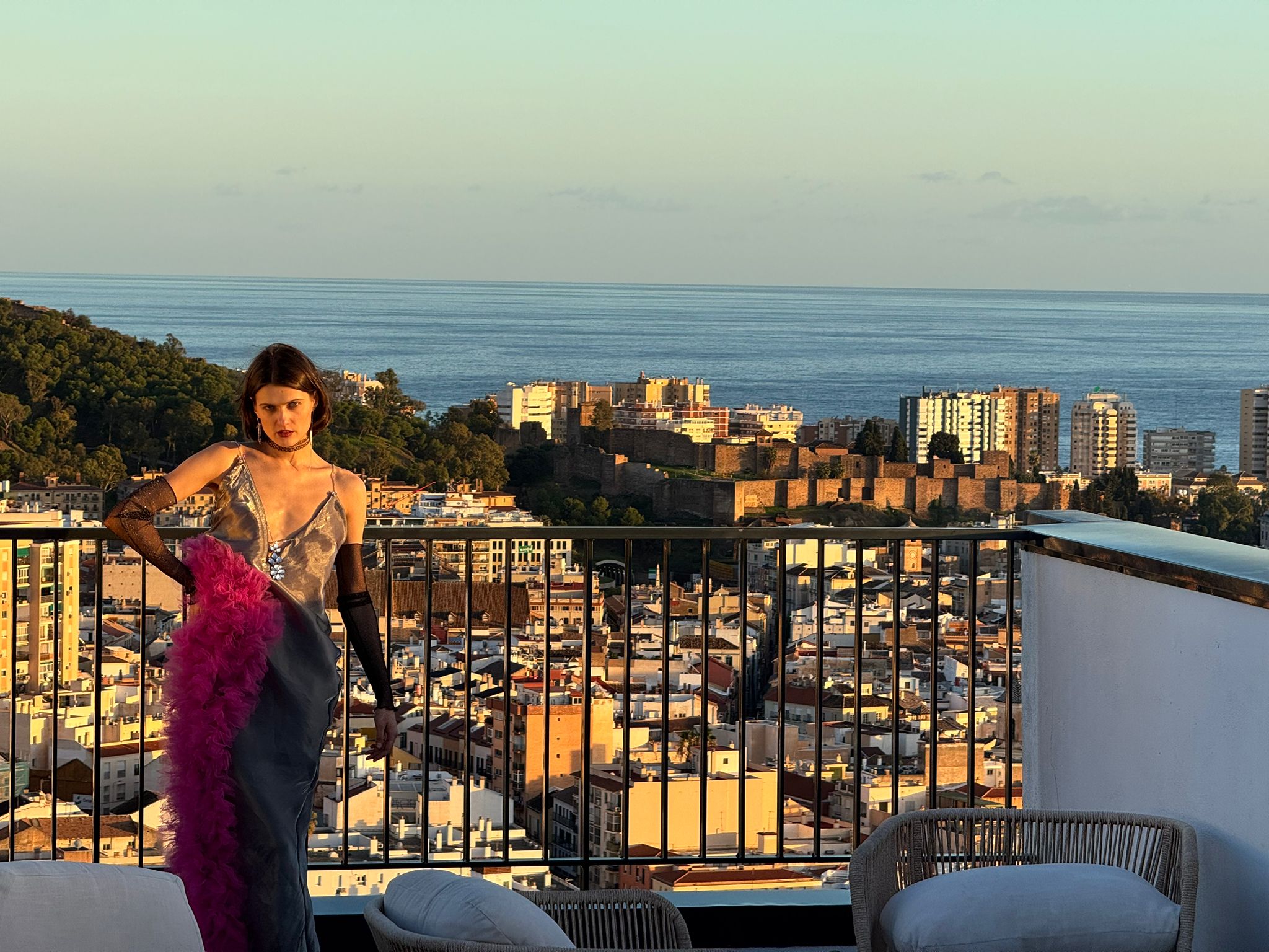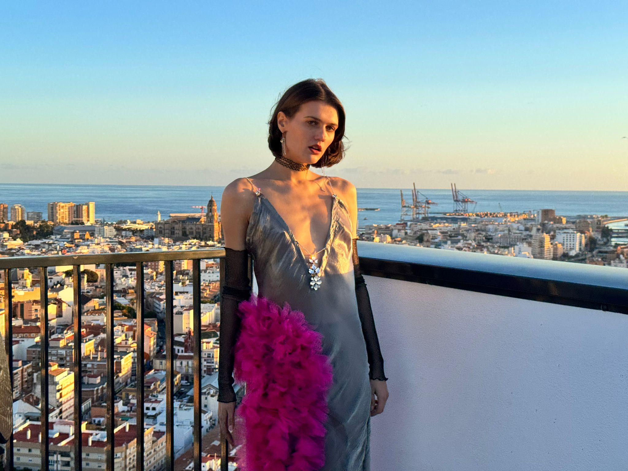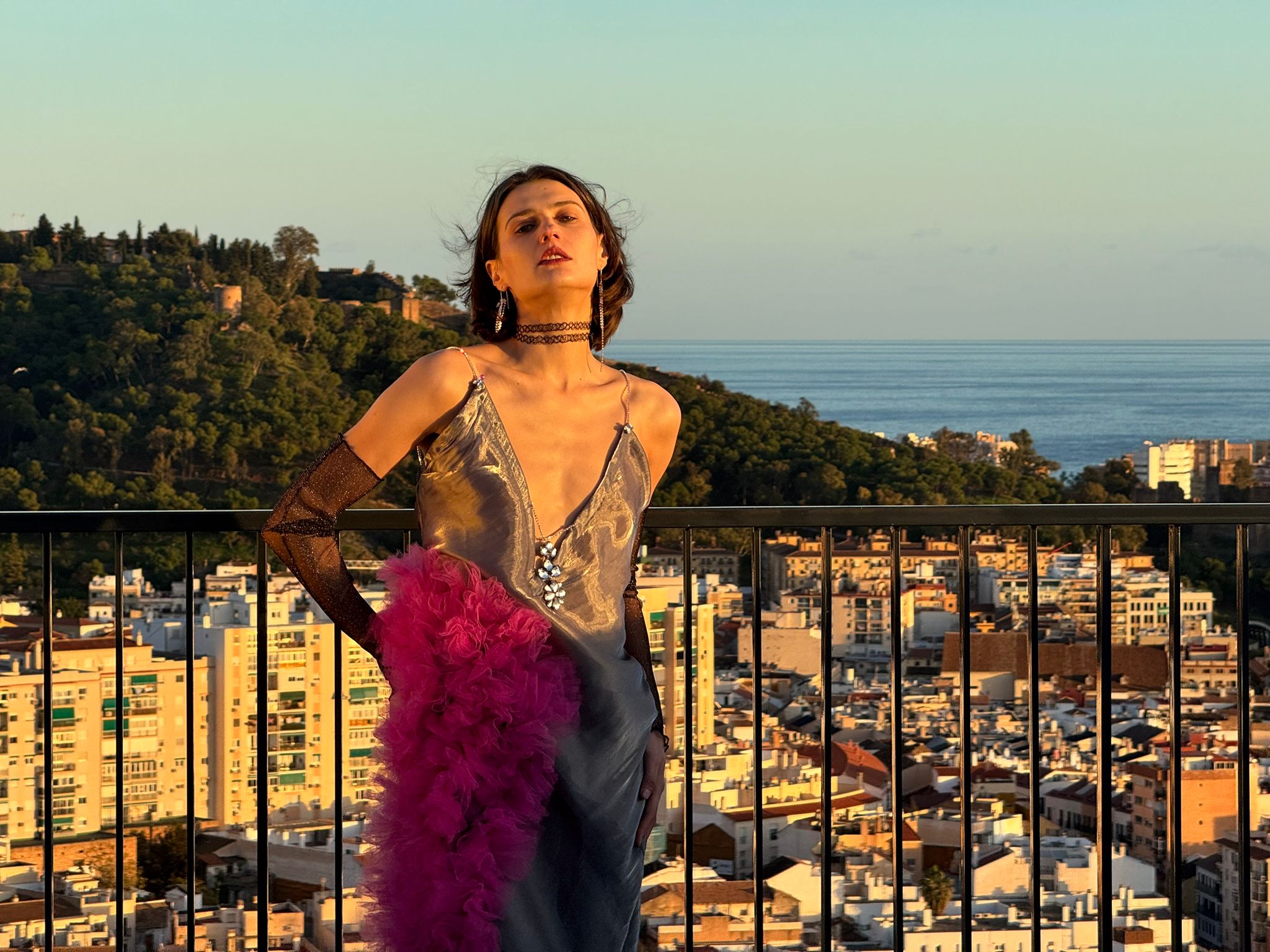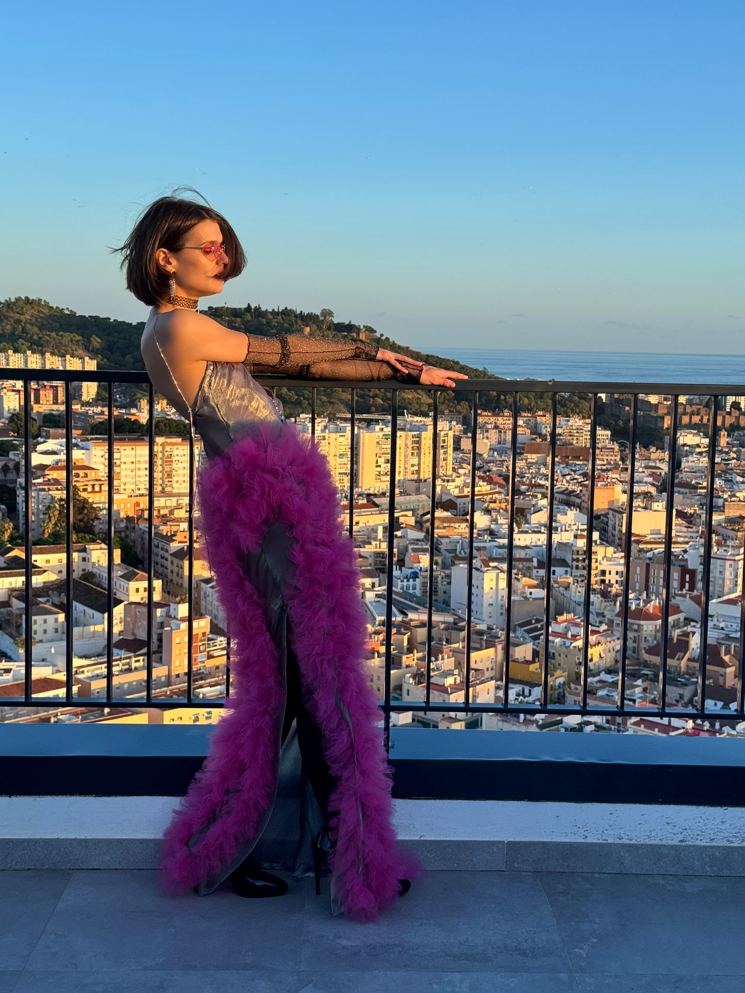 Vestido al bies de estilo lencero de raso  en color gris metalizado con gran cascada de tul fuxia en el lateral.